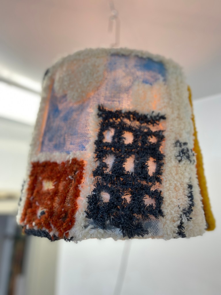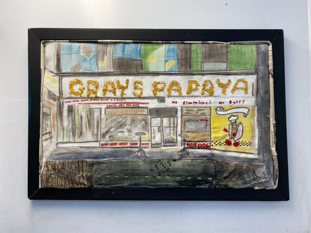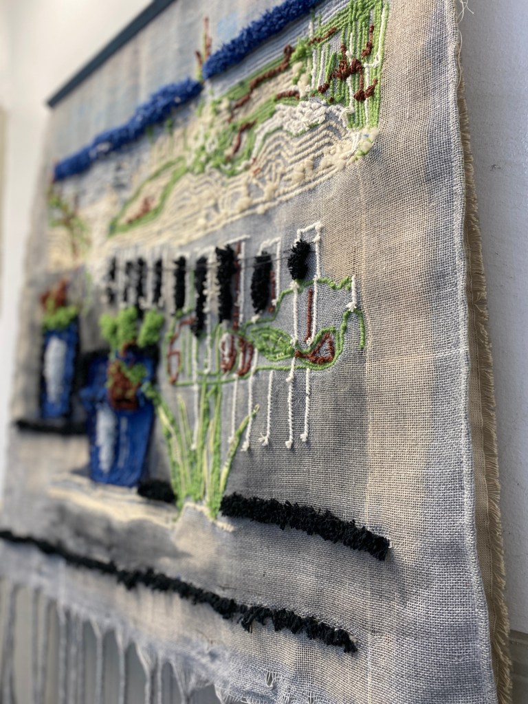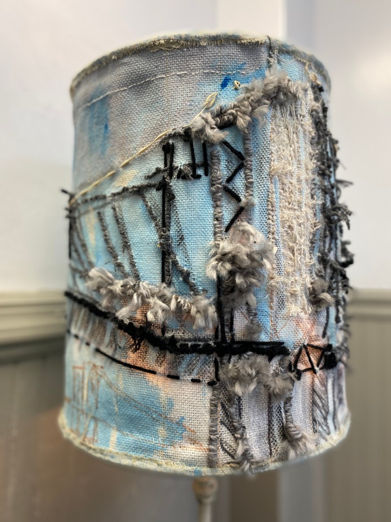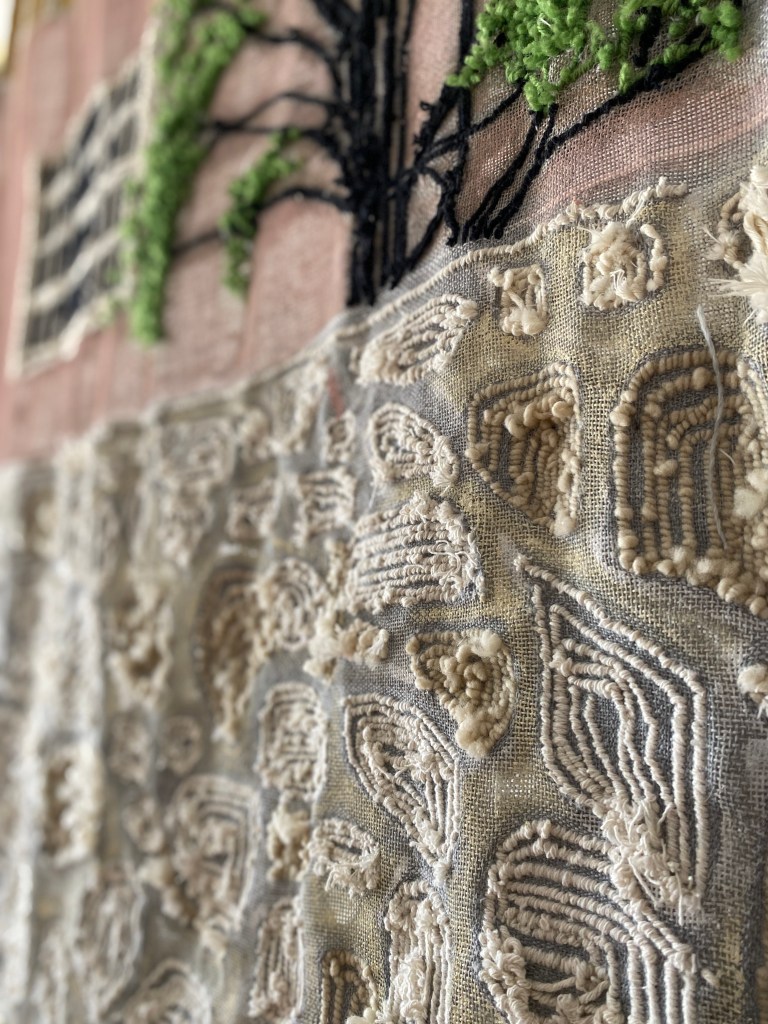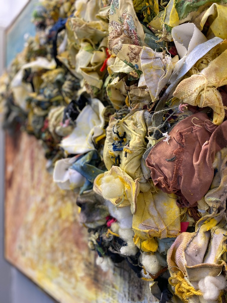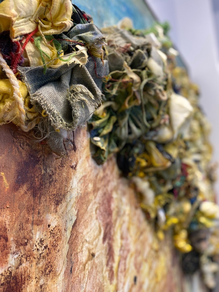 water color, enamel paint, chalk, tufting, hand embroidery, machine stitching, newspaper, resin, on monk cloth