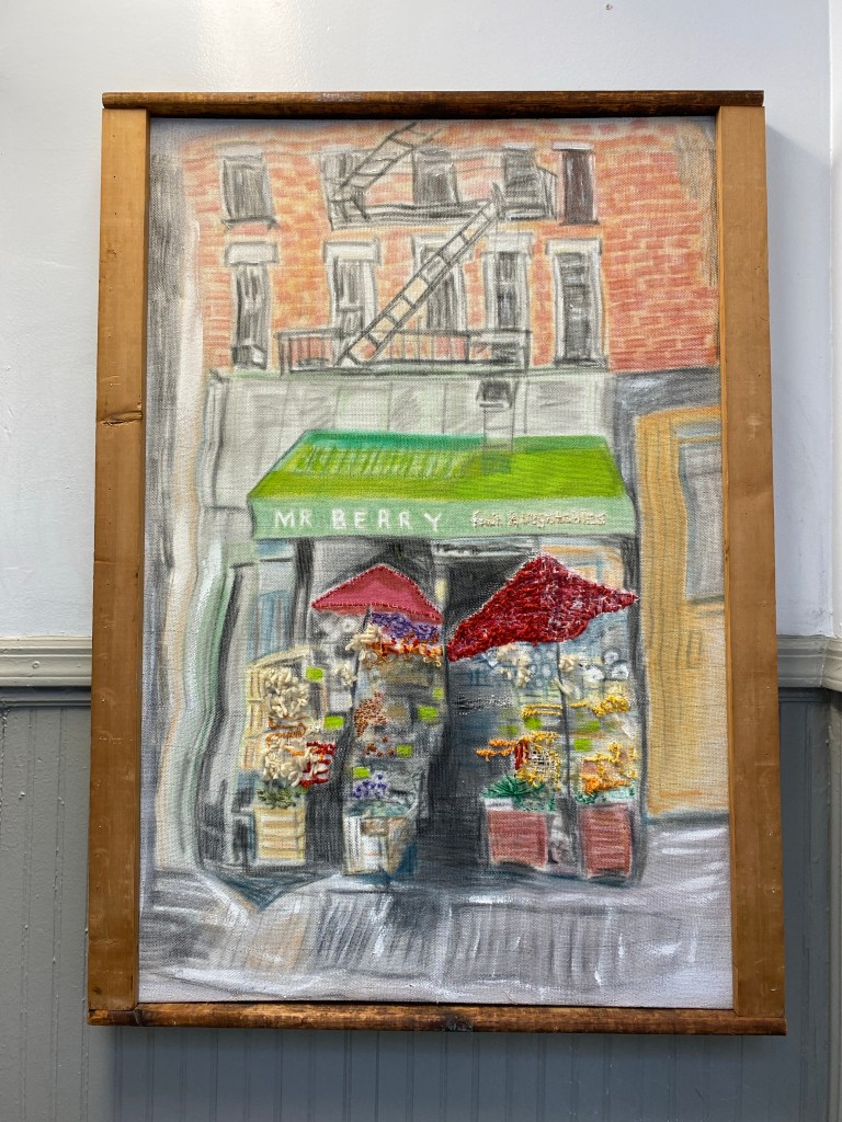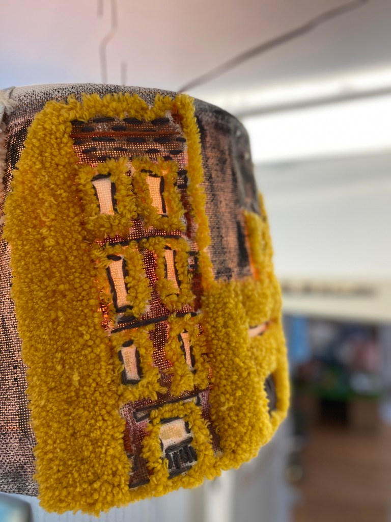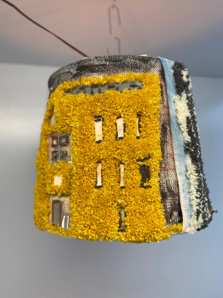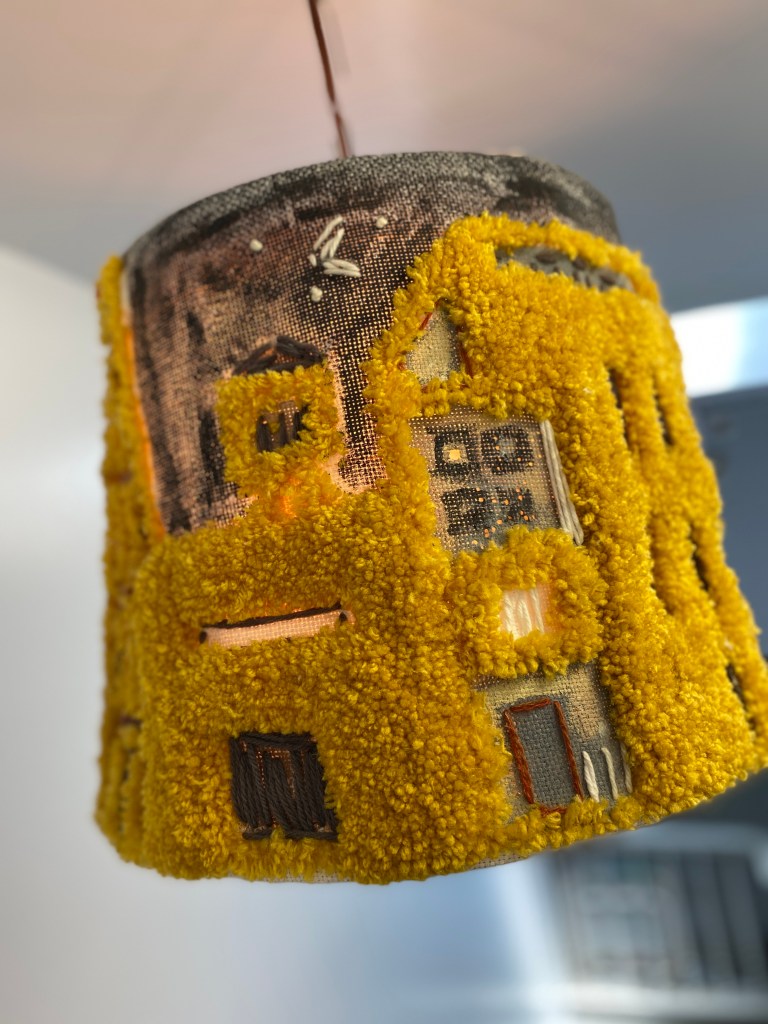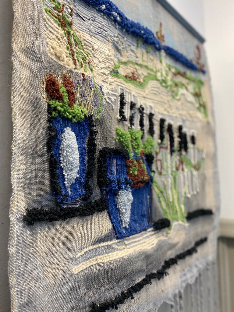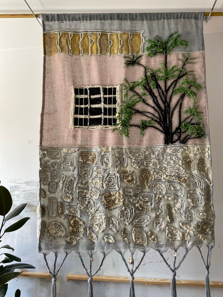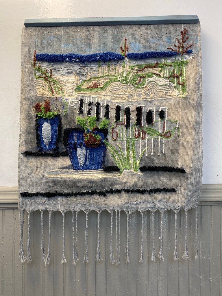water color, enamel paint, chalk, tufting, hand embroidery, machine stitching, newspaper, resin, on monk cloth