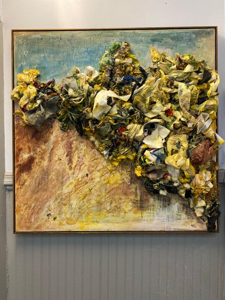 fabric scraps, wallpaper paste, dye paint, & resin on antique canvas frame