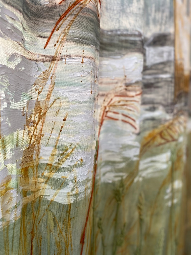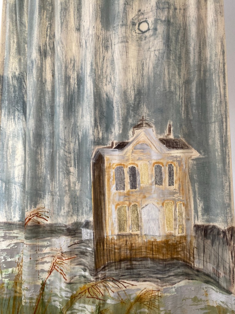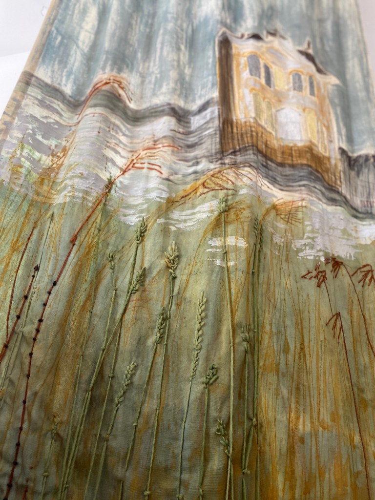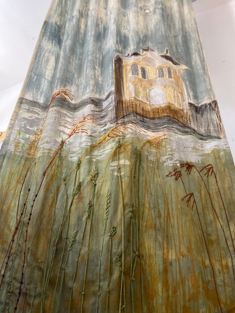 paint & dye using on site Hudson River water, hand embroidery, machine stitching on cotton curtain panel